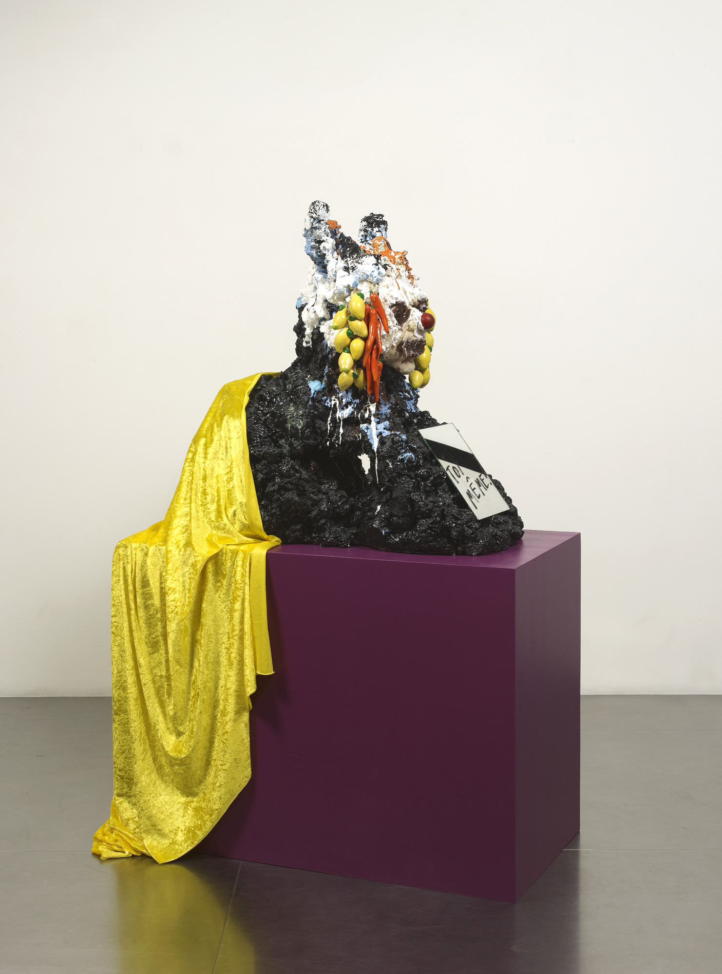 Mousse polyuréthane, céramique, miroir, peinture et tissu, socle en bois peint violet